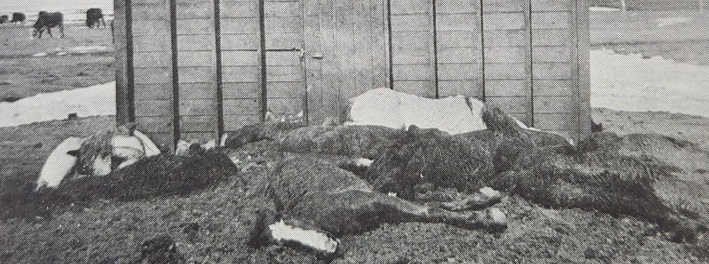 The storm continued on Sunday and Monday. Farmers were up early to feed their animals. Someone discovered about 60 head lying dead on a road allowance west of Irricana. One herd owner thought he lost half of his 600 head.