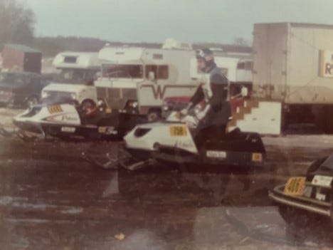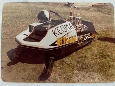 When asked about memorable products sold at Keoma Garage, Ron recalled an unusual item: snowmobiles. Allied Farm Equipment sold the Hustler and the Rustler. Both were choring models, intended for hauling feed and tools. However, when Allied switched to distributing the recreational brand Polaris, it opened a new product line. It attracted Ron, who raced snowmobiles for two years. Competitions were held on frozen lakes and the occasional racetrack in rural communities, and Ron picked up many medals and trophies. Contests were held as far away as Wetaskiwin and Golden, B. C. One exciting event was held at the Calgary Stampede Grounds.