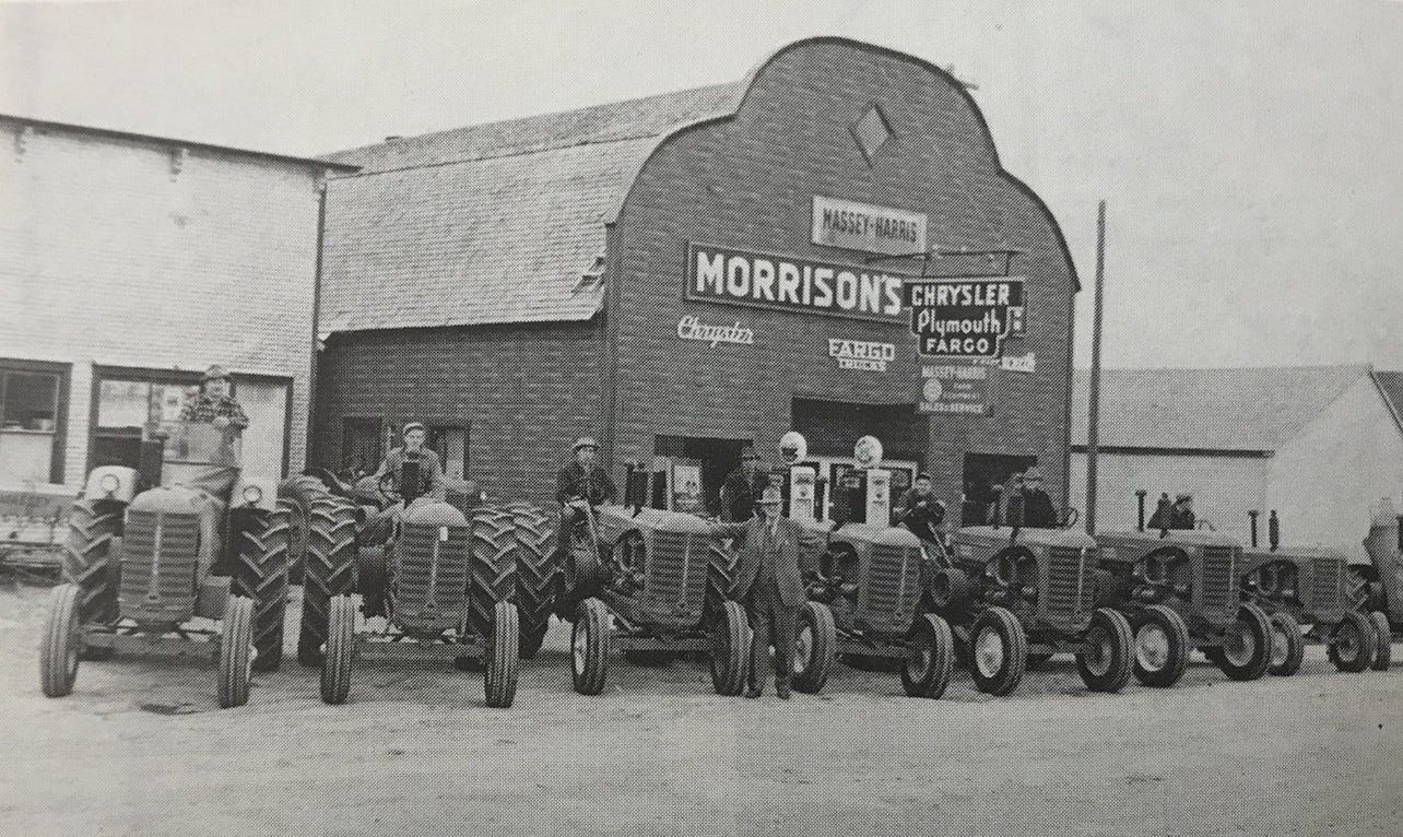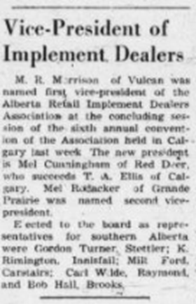 Maxwell (“Max”) Morrison was originally from Newry, Ontario. He worked for banks in Atwood, Ontario and Melfort, Saskatchewan, and Cayley, Alberta. Max returned to Ontario in 1919 to marry Lilian Stewart. The couple and their young daughter, Iris, moved from Cayley to Calgary in 1927. In 1939 the family relocated to Lethbridge. Max was now working for Massey-Harris and in 1945, the decision was made to purchase the Massey-Harris business in Vulcan. When Max’s business partner retired, the dealership became a family affair.
