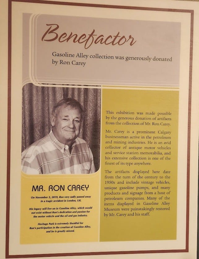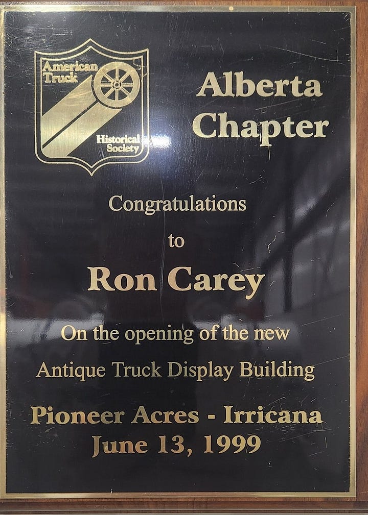 Several years later, Ron also made a major donation of vehicles and artifacts to Heritage Park which was the basis for Gasoline Alley. As his collection continued to grow, Ron added a large extension to the original building at Pioneer Acres. His display of antique trucks inspired Alberta Chapter members of the American Truck Historical Society to add another large truck museum building to Pioneer Acres in 2004.