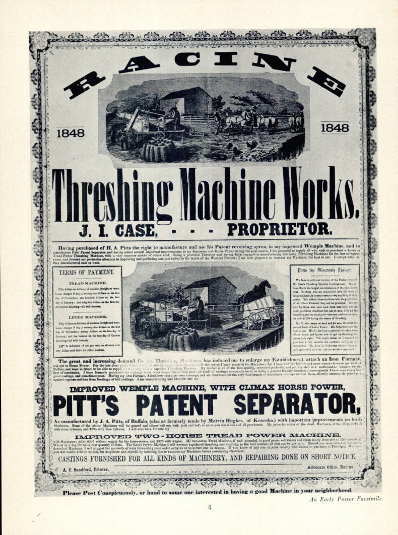 Jerome Increase Case built a three-story brick factory in 1847 on the Root River in Racine, Wisconsin. That shop became the hub of his farm machinery manufacturing business and was called the Racine Threshing Machine Works.
