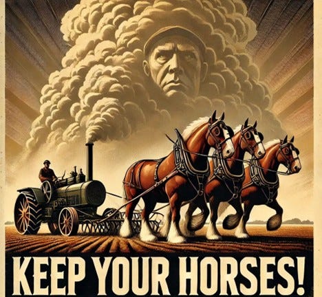 “I say stick to the horse, for he'll make you more money in the long run; besides, he will be hauling your tractors to the junk heap in a few years.” [link]
